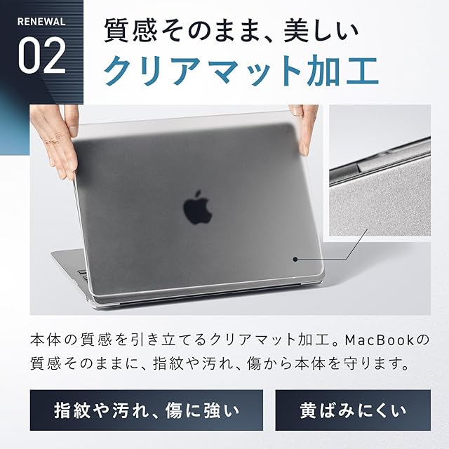 【MacBookの質感そのまま、美しいクリアマット加工タイプ】本体の質感を引き立てるクリアマット加工。MacBookの質感そのままに、指紋や汚れ、傷から本体を守ります。