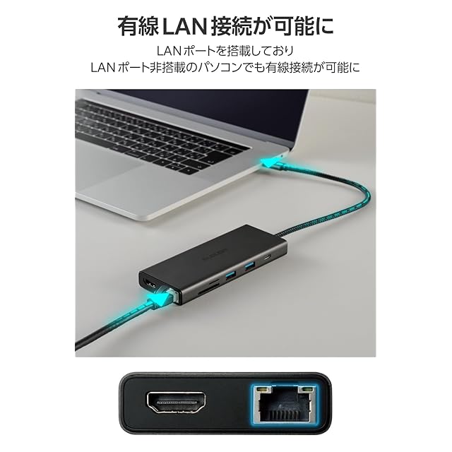 USB 5Gbps(USB3.2(Gen1))に対応したUSBポートを搭載したドッキングステーションです。USB Type-C(TM)搭載パソコンに、ケーブル1本で必要な周辺機器を一括接続できます。USBポートの他にLANポート、HDMI(R)ポート、カードスロットを搭載しています。USB Power Deliveryも対応です。