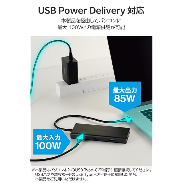 ※製品本体にて15Wを消費するため、実際の出力は最大85Wとなります。85Wで給電が必要な場合は、100W出力のAC充電器をご用意ください。