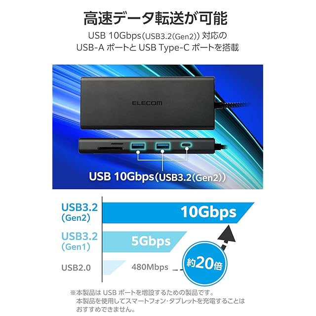充電もデータ転送もこの1台で。USB 10Gbps(USB3.2(Gen2))に対応したUSBポートを搭載したドッキングステーションです。USB Type-C(TM)搭載パソコンにケーブル1本で必要な周辺機器を一括接続できます。USBポートの他にLANポート、HDMI(R)ポート、カードスロットを搭載し、多彩な用途で活用できます。USB Power Deliveryにも対応しています。