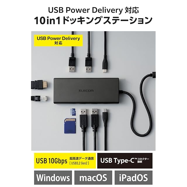 エレコム USB-C ハブ ドッキングステーション 10in1 PD対応 100W LANポート HDMI 4K60Hz 高速データ転送 10Gbps SD/microSD ブラック DST-W03 | つむぎ屋