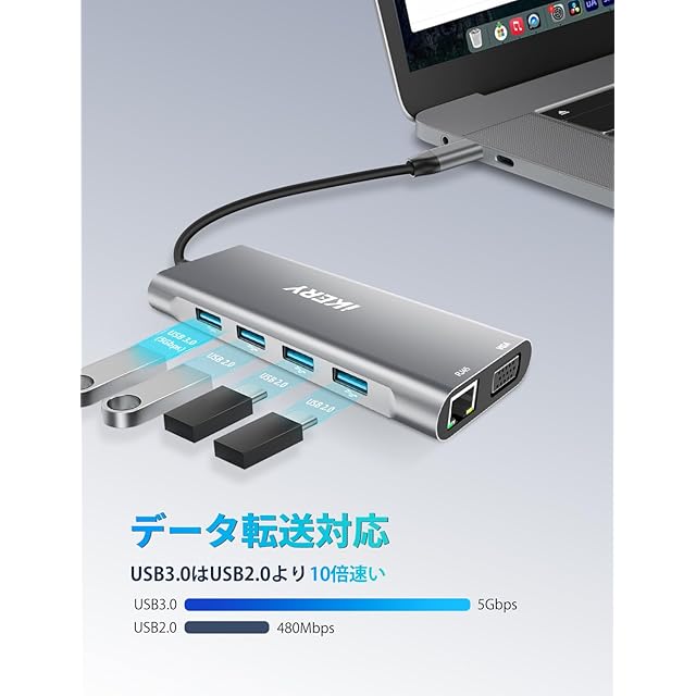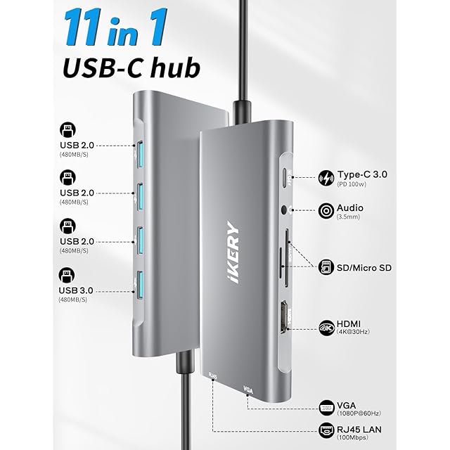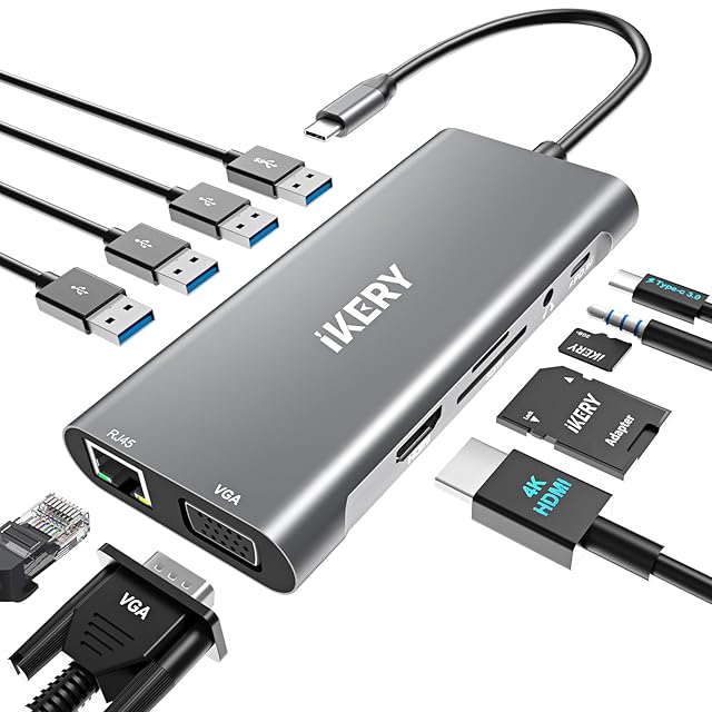 IKERY 11-in-1 USB-C ハブ ドッキング ステーション、5 Gbps USB-A および USB-C データ ポート、4K HDMI、DisplayPort、100W PD、VGA、USB 3.0 ポート、タイプ C、RJ45 イーサネット、SD/TF カード リーダー、3.5mm AUX、MacBook Pro などに対応