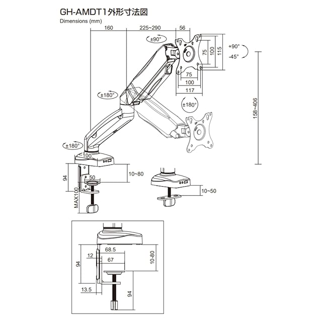 グリーンハウス モニターアーム 17-32インチ対応 耐荷重2-9kg 3年 メカニカル 4軸 GH-AMDT1-BK