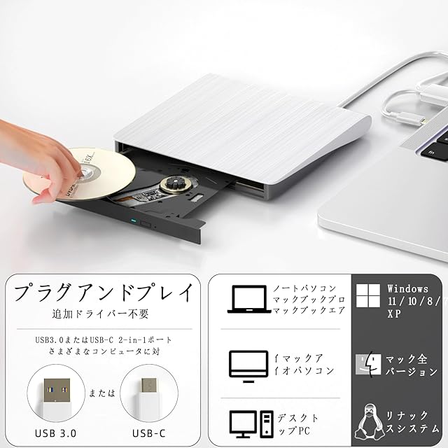 ブルーレイドライブ外付け BDプレイヤー再生読み書usb-aと usb-c(type-c) 対応外付け ポータブルBD Windows7-11/MAC OS対応 一年 日本語取扱書付き(white)