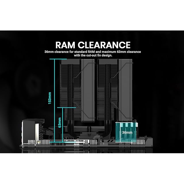 【RAM互換性】このCPUエアクーラーは、標準的なRAMに40mmのクリアランスを提供し、切り込みフィンを使用した場合は最大63mmの高さまで対応します。