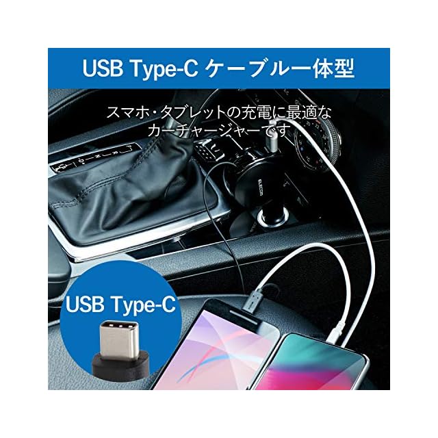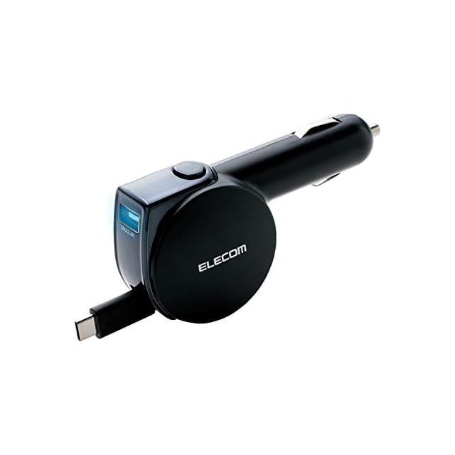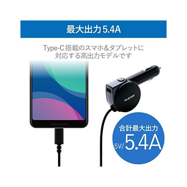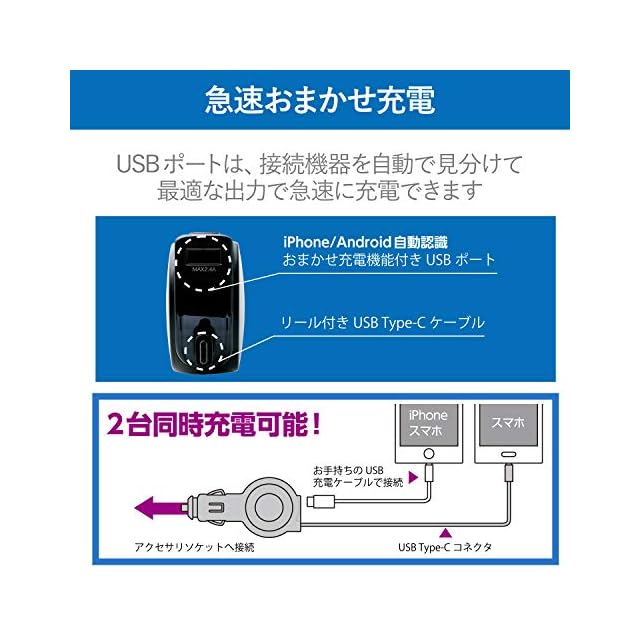 USB Type-Cコネクタに対応。 巻取り式のUSB Type-Cコネクタと、おまかせ充電に対応したUSBポートを搭載し、合計最大出力5.4Aの高出力でスマートフォンやタブレット2台を同時に充電できる車載充電器。