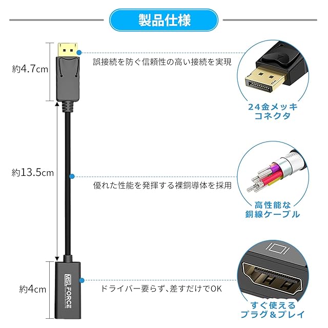 【優れた安定性】24k金メッキ処理を施したDisplayPortオスおよびHDMIコネクタは腐食や摩耗、サビに強いです。多重シールド処理によって信号のロスやノイズ等を最低限まで抑え、安定した映像音声を提供します。