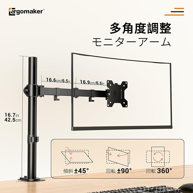スペース節約:ディスプレイをアームに取り付けることで、デスクトップから浮かせることができ、他の作業やアイテムのためにスペースを確保することができます。これにより、デスクトップが整然とし、より大きな作業スペースが確保されます。