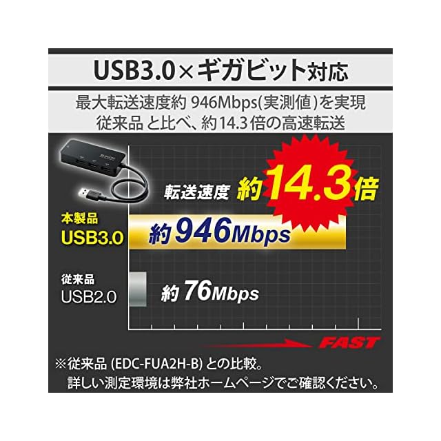 ギガビットLANアダプターを使ったギガビット通信とパソコン接続部USB3.0の組み合わせにより、USB2.0搭載の従来品(EDC-FUA2H-B)と比べ、ダウンロードしたデータを14.3倍(実測値)の速度で高速転送ができます。