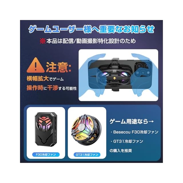 【ご使用上の注意】 本製品はライブ配信・動画撮影・車載使用に最適化された設計のため、大型冷却プレートを採用しています。ゲームプレイ時の操作性を重視される場合は、よりコンパクトな「Besecou F30冷却ファン」または「GT31冷却ファン」のご利用をおすすめします。