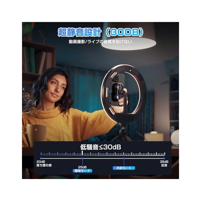 【静かで便利な冷却操作】 30dB以下の図書館レベルの静音設計で、ライブ配信中でも音を気にする必要がありません。電源・冷却強度・LED照明の3つの独立ボタンを搭載し、夜間の配信時には不要な照明をオフにできるなど、細かい調整が可能です。冷却機能だけが必要な時も、LEDだけを点灯させたい時も、シーンに合わせて自由にカスタマイズできます。