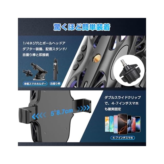 【ライブ配信に最適な冷却スタンド】 三脚や自拍棒に直接取り付け可能な1/4ネジ穴とボールヘッドアダプター付き。スマホを固定しながら背面全体を効率冷却する対向式ファン設計で、長時間のライブ配信でも過熱による画質低下を防止。4-7インチのスマホにしっかり固定可能なダブルスライドクランプを採用。
