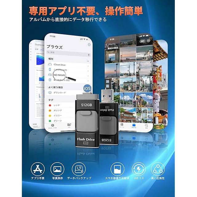 【完全アプリ不要のUSBメモリ、操作簡単で使いやすい】このUSBメモリ512gbは、アプリをダウンロードする必要がなく、スマホのアルバムから動画や写真データを外付けUSBメモリに直接保存できて、機器が苦手な方でも簡単にデータを移行できます。専用アプリをダウンロードする必要がなく、Phone対応外付けストレージはより便利で安心して使えます。