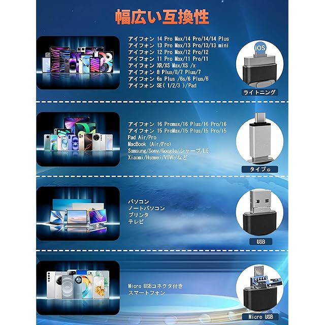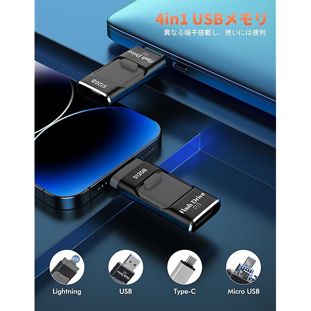 【4in1USBメモリ・互換性抜群】本USBフラッシュメモリは、ライトニング、タイプc、USB、Micro USB ポートを搭載しており、iOS、Android、Windows、およびOSシステムと互換性があります。1つのUSBメモリで各デバイス間でデータを共有し、バックアップすることができます。詳細機種:アイフォン16ProMax/16Pro/16Plus/16/16/ProMax/15Pro/15Plus/15/14ProMax/14Pro/14Plus/14/SE3/13ProMax/13Pro/13/13mini/12ProMax/12Pro/12/SE2/11ProMax/11Pro/11/XR/XSMax/XS/X/8Plus/8/7Plus/7/SE1/6sPlus/6s/6Plus/6/Pad Pro(第1/2/3/4/5/6世代)/Pad Air(第1/2/3/4/5/6/7世代)/MacBook(Pro/Air)/Pad mini(第1/2/3/4/5/6/7世代)/Pad(第5/6/7/8/9/10/11世代)/タイプcスマホ/PC/タブレットなど。v