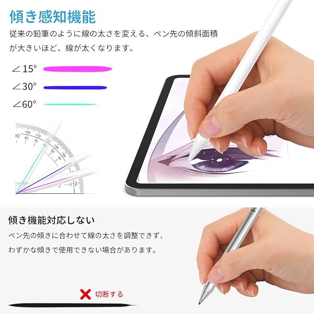 「傾きを感知機能」KINGONE iPad ペンは、傾きを感知できるので、ピクセルレベルの精密さを持ちながら、従来の鉛筆のように線の太さを変えるのも、アーティスティックな効果をいろいろ加えるのも思いのままです。絵描き最適!(ご注意:傾き感知機能対応ソフト:SketchBook、Procreate、Paper、Noteshelf )
