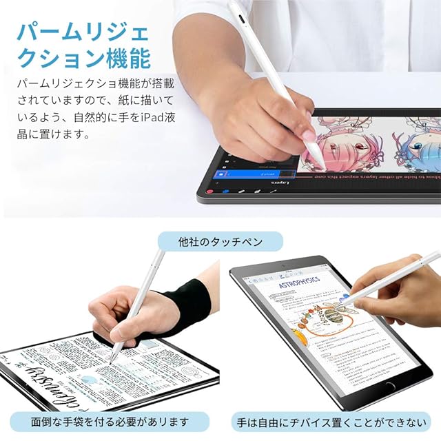 「誤作動防止&磁気吸着機能」KINGONE iPad タッチペンは、磁気吸着機能が付き、出張、会議などに保管と持ち運びに便利です。また、パームリジェクションという機能が搭載されていますので、手袋がいらず、紙に描いているよう、自然的に手をiPad液晶に置けます。ご注意:磁気吸着機能対応デバイス:iPad Pro 12.9”(第三/四世代); iPad Pro 11”