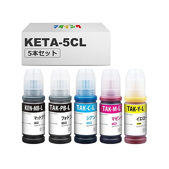 【セット内容】マタインクのエプソン用 KETA-5CL インクボトル には KEN-MB マットブラック / TAK-PB フォトブラック / TAK-C シアン / TAK-M マゼンタ / TAK-Y イエロー 各1本入り、合計5本セット。