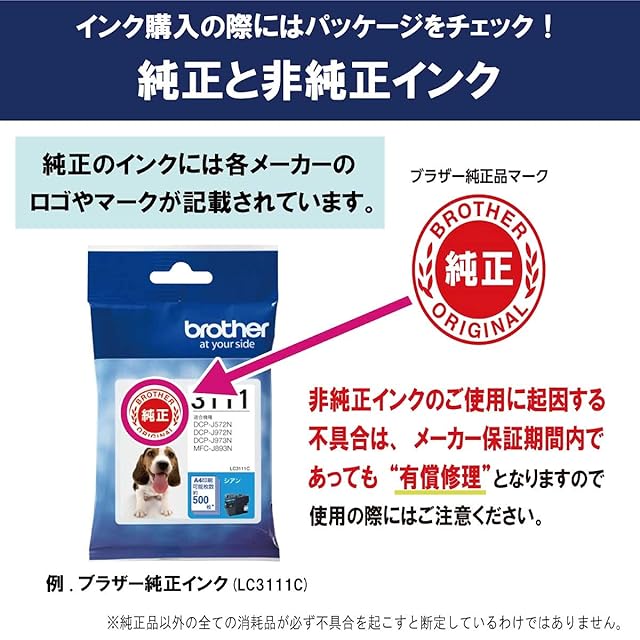 ブラザー純正インクは製品本体の性能を十分に発揮するために研究を重ね、開発されています。非純正インクをお使いになりますと製品本体の性能を十分に発揮できないだけでなく製品本体を損傷させる可能性がありますのでご注意ください。