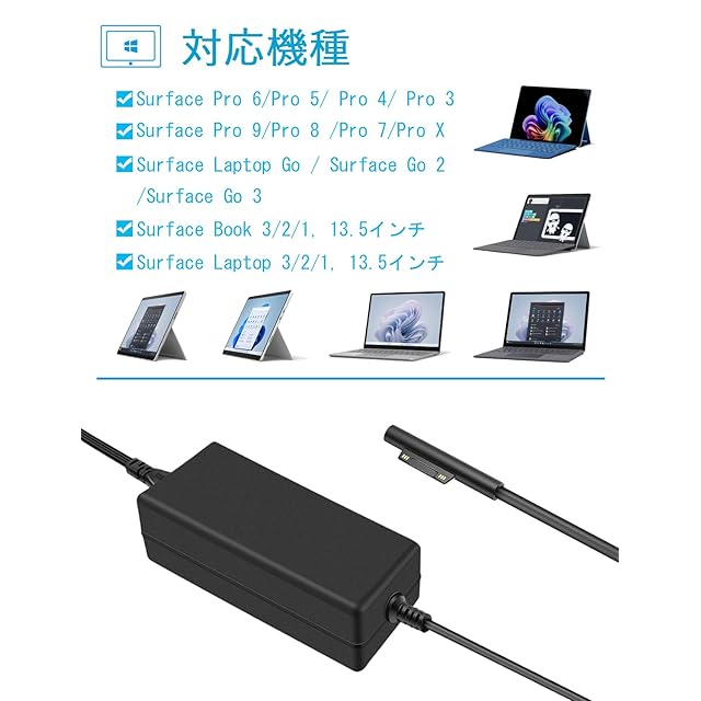 互換性: 65W 15V 4A 1706 /2062/充電器、44W 15V 2.58A 1800 充電器、39W 15V 2.6A 1963 充電器 36W、 12V 2.58A 1625 充電器、24W 15V 1.6A 1735/ 1736 充電器 (12V 2.58A 36W、15V 1.6A 24W、15V 2.58A 44W、15V 4A 60W 自動調整)。以下は一部Surfaceシリーズ対応機種です。例えば:Surface Pro 3、Surface Pro 4、Surface Pro 5、Surface Pro 6、Surface Pro 7、Surface Pro 7+、Surface Pro X、Surface Pro 8、Surface Pro 9、Surface Pro 10、Surface Pro (第 11 版)、Surface Pro 2017、Surfaceラップトップ、Surface Laptop Go、Surface Laptop Go 2 、Surface Laptop Go 3 、Surface Book、Surface Go、Surface Go 2、Surface Go 3、Surface Go 4などの互換性があります。