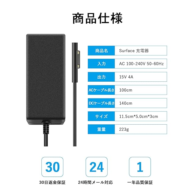 Surface Pro 電源アダプターと互換性あり商品仕様: :入力 100-240V 50/60 Hz、 出力:15V/4A( 65W 15V 4A、44W 15V 2.58A、36W 12V 2.58A、24W 15V/1.6Aに対応可能)本製品を購入する前に、ご使用デバイスの入力電圧・入力電流等にて適合の判断を必要です。