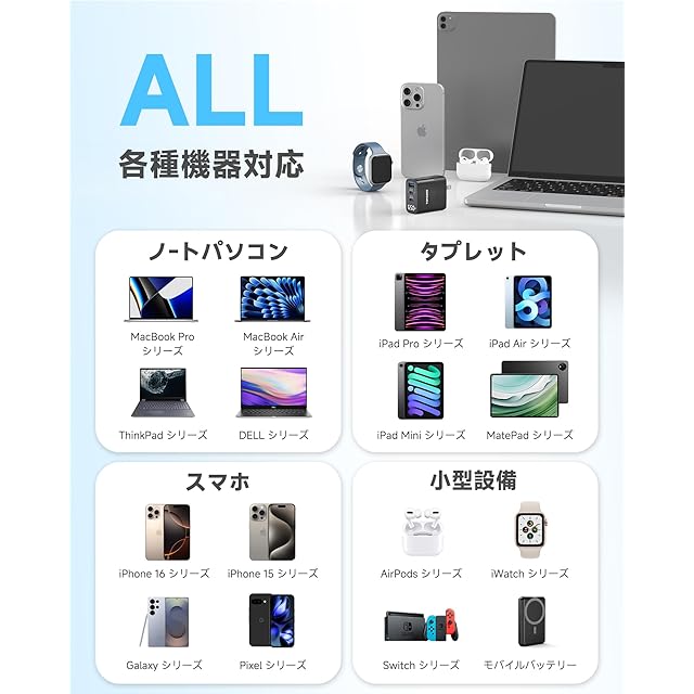 【幅広い互換性対応】弊社の65W pd 充電器は、PD3.0/QC4+、QC3.0/QC2.0、PPS、SCP、FCP、AFC、PE+など9つの主要急速充電プロトコルに幅広く対応し、コンセント タイプc (Type-Cポート) を備えたMacBook、iPad、iPhone、Galaxyシリーズ、華碩(ASUS)、レノボ(Lenovo)、富士通(FUJITSU)、HP(ヒューレットパッカード)、東芝(TOSHIBA)などデバイスに充電対応です。出張時には「MacBookとiPhoneの同時充電対応」、リビングでは「iPadとAndroidスマートフォンの並列充電対応」、オフィスでは「ノートパソコンとワイヤレスイヤホンの効率的な充電」など、多様なシーンで活躍。2台のアダプターで家中の複数デバイスの充電をカバー。 充電器の交換や持ち運びの手間がなくなり、便利です。※お使いの端末すべてに最大出力での充電をしておりません。 各出力での給電に対応している製品であるか、搭載のUSB-CはPD充電対応しているのかを製品もしくはメーカーに直接ご確認くださいますようお願いいたします。