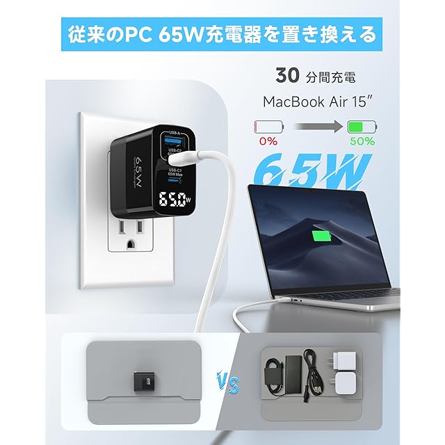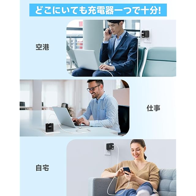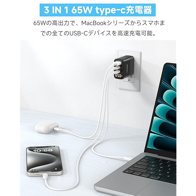 【3 IN 1 PD 充電器 65W】外出前や緊急時にバッテリー切れ?そんな時こそ、弊社のPD 充電器 USB-Cが大活躍します!安価でPDに対応していないusb c 充電器とは異なり、弊社の65W 充電器は Power Delivery (PD)およびQuick Charge (QC)技術を採用し、30分でMacBook Air M2を0〜50%まで充電可能で、フル充電時間を40分以上短縮し、毎日1時間以上の時間を節約できます。外出や忙しい生活の中で充電待ちの時間を大幅に短縮し、充電のストレスから解放され、日常生活がより快適になります!さらに、本製品の充電器 type-cはType-Cポート*65W Maxを2つ、USB-Aポート*60W Maxを1つ搭載し、3台のデバイスを同時充電に対応。まさに、pd 充電器 65w を1台持つことは、パソコン用+携帯電話用+小型機器用のacアダプターを1台持つことに相当し、テンポの良い充電ライフを実現します。旅行でも自宅でも、この1台で十分です!