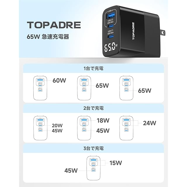 <p>急な出張前にスマホのバッテリーが残り10%?新幹線での移動中にノートパソコンとタブレットを同時に充電したい?TOPADRE急速充電器が多忙な現代人の悩みを解決!ノートパソコン、スマートフォン、タブレットまで、あらゆるデバイスを 最大65Wの高出力 でサポートする多機能 充電器 です。USB コンセント としても利用可能で、複数の機器を同時に充電可能な3ポート設計を採用。充電器 Type-C ポートでは、パソコン やゲーム機など タイプC 充電器 対応機器を最大限の速度で 急速充電 します。</p> <p>軽量コンパクトながら、過熱保護や過電流防止機能を搭載し、安全性も確保。旅行先やオフィス、自宅など、あらゆるシーンで高速・効率的な充電を実現します。「タイプc 充電器」 と 「急速充電器」 の両方のメリットを兼ね備えた、次世代のガジェットです!</p>