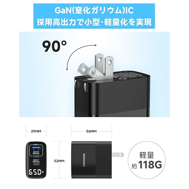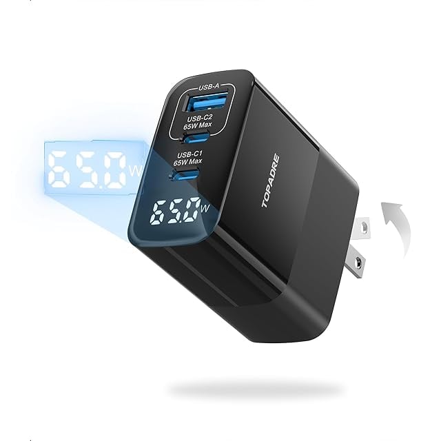 TOPADRE 65W 急速充電器 type-c【LEDディスプレイ搭載·折りたたみ式プラグ·軽量·GaNIII技術·三台同時充電】 PD 充電器USB-C×2 & USB-A 携帯タイプc充 電器 ノートPC用 ACアダプター PD3.0/QC4.1/PPS 規格対応 コンパクト MacBook/Surface/iPad/iPhone/Samsungなど/Android機種対応 出張·旅行 黒色 | つむぎ屋