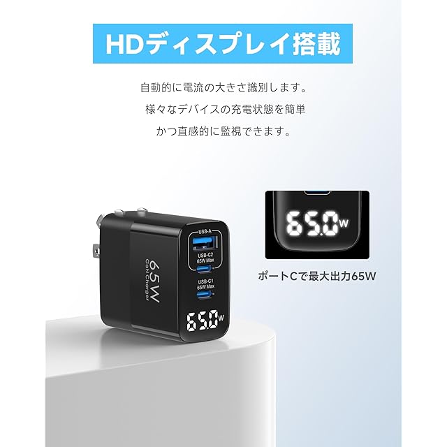 【 ディスプレイ搭載・折り畳み式コンパクト設計·118g 超軽量】弊社の65W 充電器は高精細デジタルディスプレイを搭載し、充電状況をリアルタイムで表示いたします。接続されたノートパソコン・スマートフォン・ゲーム機等のデバイスを自動検出し、各機器に最適な電流値を認識・調整いたします。これにより、USBコンセントとしての安全性と充電効率を両立させたインテリジェント充電を実現しております。さらに、当社の急速充電器は折り畳みプラグを採用し、従来のタイプC 充電器と比較して50%コンパクトな設計により収納性を大幅に向上。わずか118gの超軽量ボディが実現する驚異の携帯性は、ビジネスバッグのペンホルダー収納や新幹線座席のUSB コンセントへのスムーズな挿入を可能とし、移動中でも快適な充電環境を提供いたします。