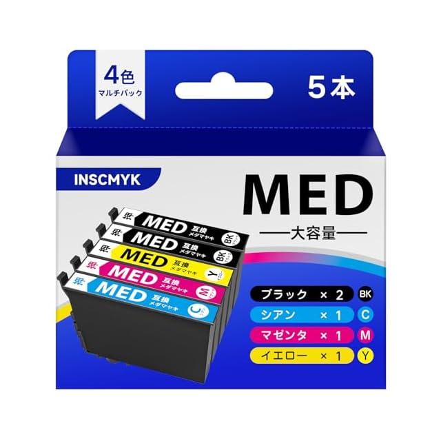 【セット内容】 この メダマヤキ 互換 インク 5本パックには MED-BK ブラック *2/ MED-C シアン / MED-M マゼンタ / MED-Y イエロー があります。