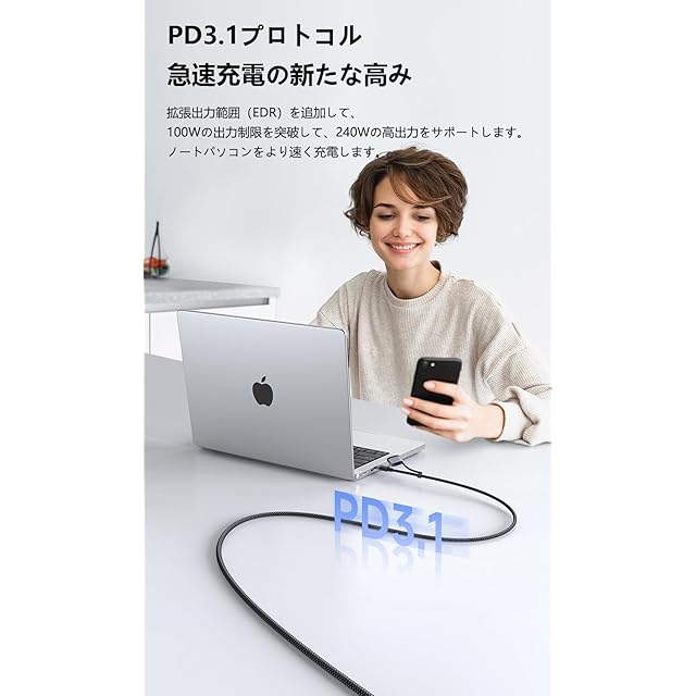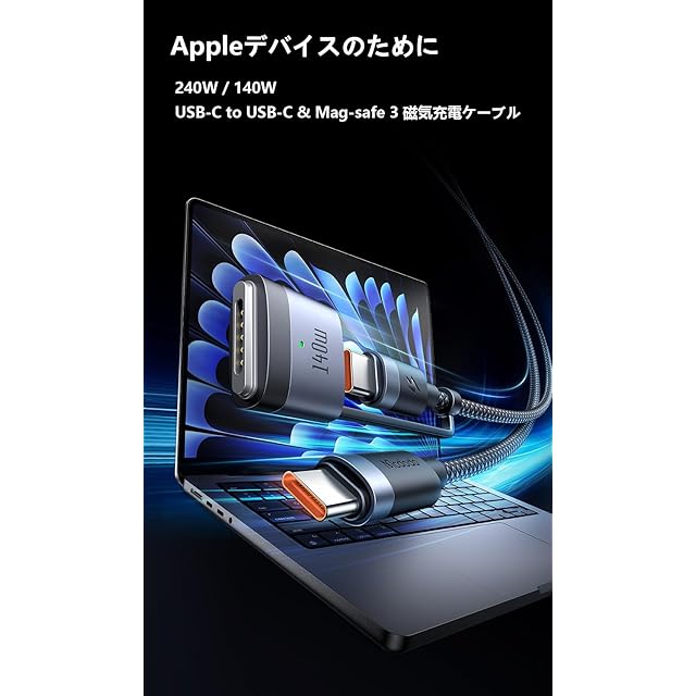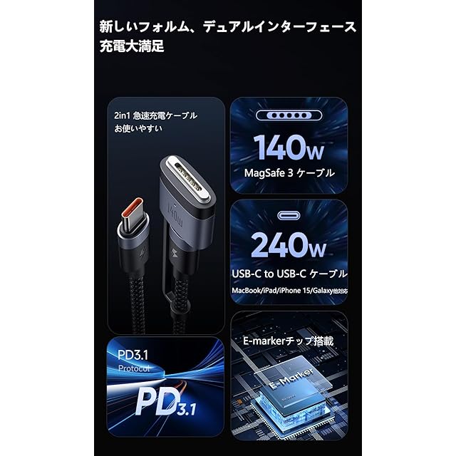 【240W / 140W USB-C to USB-C & Mag-safe 3 磁気充電ケーブル】:新しいフォルム、デュアルインターフェース。充電大満足。140W MagSafe 3 磁気充電ケーブル、240W USB-C to USB-C ケーブル。PD3.1 急速充電新規格を対応し、且つE-Markerチップを搭載して、最大140Wの出力でMacBook Pro 16“を約30分で55% まで充電します。ワンタッチで吸着、瞬間に急速充電。【Mac機種を互換】:MacBook Air(M2チップ、2022年機種)、MacBook Pro 14”(2021年/2023年機種)、MacBook Pro 16“(2021年/2023年機種)などMacの機種を対応します。本2in1急速充電ケーブルは、MacBook Pro/Air、iPad Pro/Air、iPhone 17/16/15シリーズ、Xperia/Galaxy/AndroidなどUSB-C機器を対応します。
