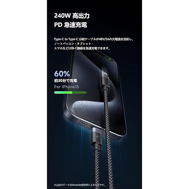 【240W 高出力】:Type-C to Type-C 分岐ケーブルが48V/5Aの大電流を対応し、ノートパソコン・タブレット・スマホなどUSB-C機器を急速充電できます。iPhone 15を約30分で60% まで充電します。※上記のデータはMcdodo研究所によるものです。【PD3.1プロトコル 急速充電の新たな高み】:拡張出力範囲 (EDR) を追加して、100Wの出力制限を突破して、240Wの高出力をサポートします。ノートパソコンをより速く充電します。【高速データ転送も対応】:480Mbpsの伝送スピード、同時に高速充電と高速転送をサポートします。