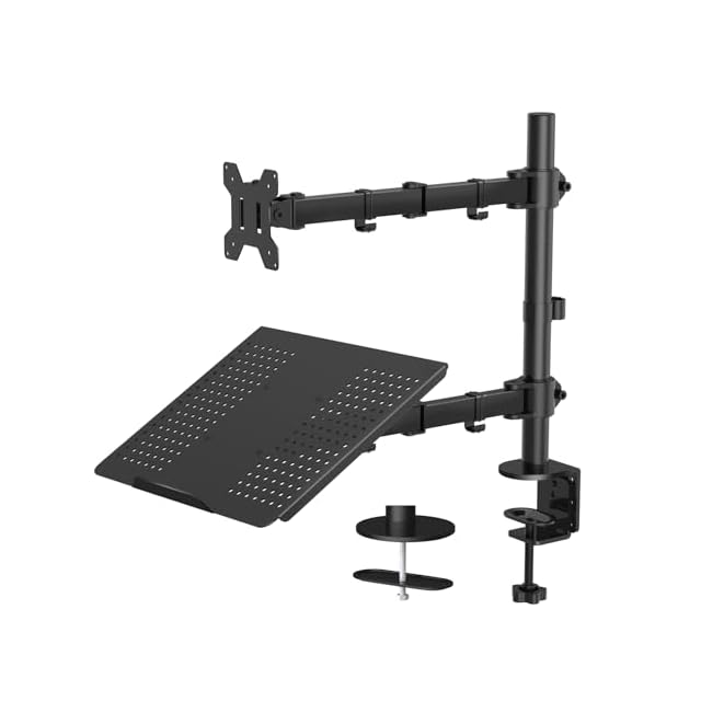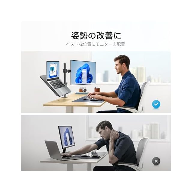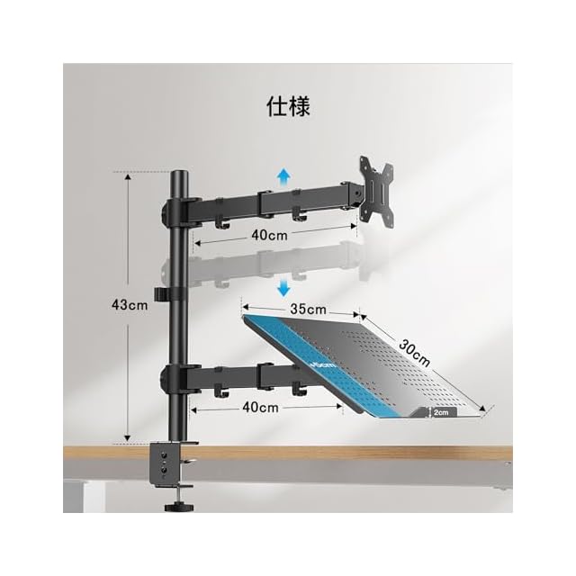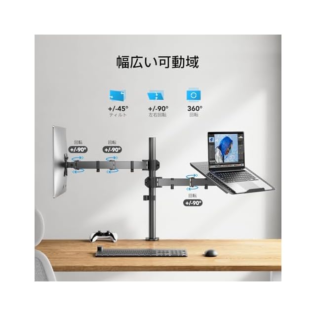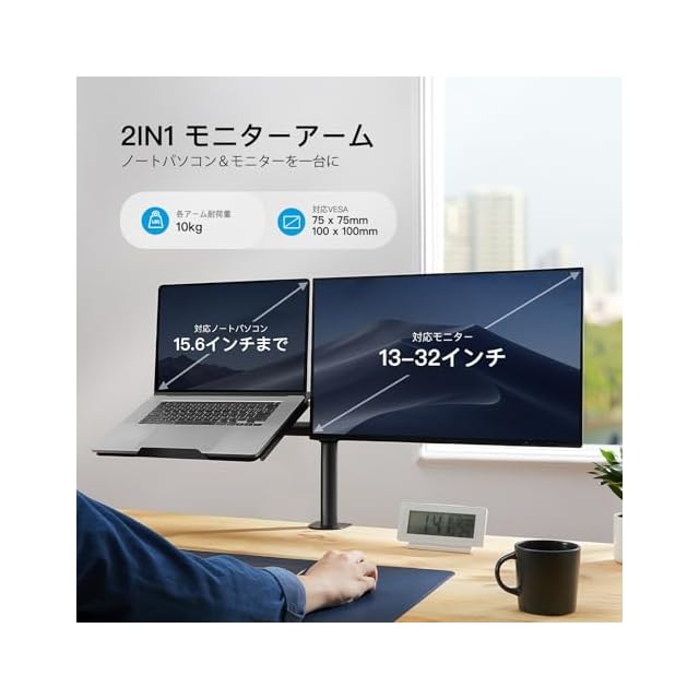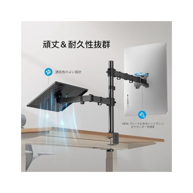 【2in1モニターアーム】PCモニターアームとノートパソコンスタンドが融合されていて、ディスプレイやノートパソコンがより快適に使えます。PCモニターとノートパソコンという組み合わせになってますが、2枚PCモニターをつけることも可能です。PC&ノートパソコンのデュアル環境の方にお勧めです。