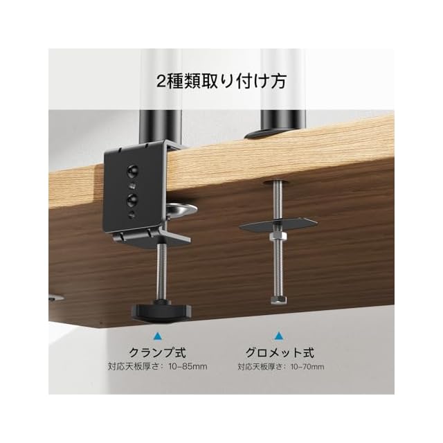 【組立・取付簡単】クランプ固定とグロメット固定二つの取り付け方があります。机にしっかり固定するので、液晶ディスプレイの転倒を防ぎ、耐震にも効果があります。