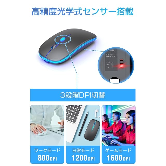 【3段階DPI切替&高い互換性】3段階のDPI調整でマウスの速度を自由自在に調節可能。800DPIは編集やデザインに最適で、1200DPIや1600DPIはゲームや精密な作業に適しています。2つの接続モードが搭載されており、パソコンだけでなく、タブレットやスマートフォンなどほとんどのデバイスにペアリングして操作可能です。