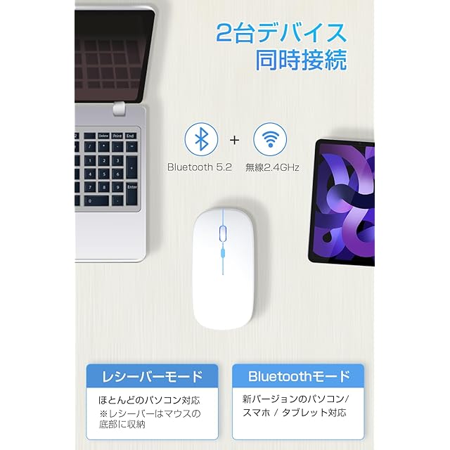 【Bluetooth5.2&2.4GHz無線技術】2.4GHzのワイヤレステクノロジーとBluetooth 5.2が組み合わさり、マウス底部の電源ボタンをひと押しするだけで、簡単にレシーバーモードとBluetoothモードを切り替えられます。両方のモードで異なるデバイスに接続後、ワンタッチで両方のデバイスを同時に操作可能。従来のペアリングやレシーバーの切り替えが不要です。(Bluetoothをリセットする方法:DPIとホイールを同時に長押し)