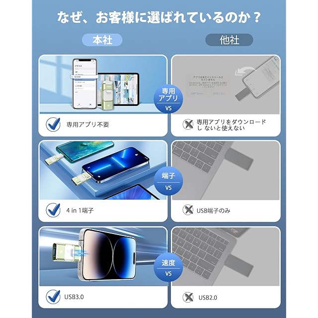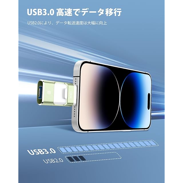 【高速でデータ移行・12ヶ月間】USB2.0により、USB3.0のUSBメモリーはより高速で、データが多くても、より短い時間で転送できます。高速的なテクノロジー時代に欠かせないiPhone対応USBメモリです。USBメモリーの読み込み速度は30-80MB/sに達することができ、書き込み速度は10-30MB/sに達することができます。(実際の速度はハードディスクの読み込み速度、書き込み速度と関係があります)。こちらのUSBメモリ256GBは1年間の品質と購入後の3ヶ月内で初期不良の交換サービスを行っておりますので、安心してご購入頂けます。初期不良および使用中の故障がございましたら、各種対応をさせて頂きますのでご安心ください。ご注意:1.データを保存する前に、スマホのケースをはずして、表側と裏側も差し込んで、usbを接続してください。2.USBのバージョンは2023版ですが、今出品のUSBも今年2024にから生産された新製品なので、安心して使ってください.3.USBメモリを挿入した後、2~5秒ほど待ってください、認識できます。