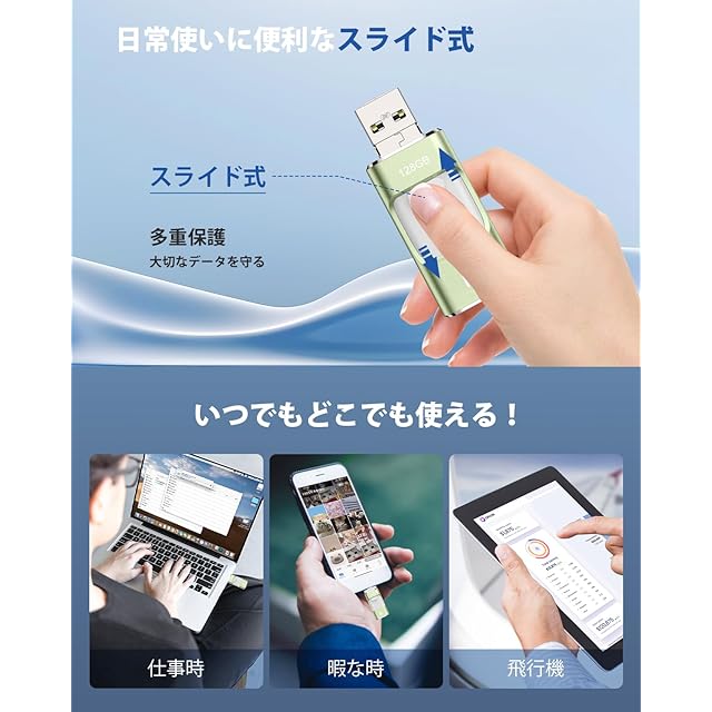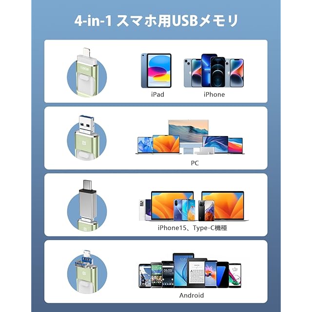 【2024年登場 専用アプリ不要】iPhone usbメモリ 128GB 高速 バックアップ 4in1 iPad メモリー スライド式 iOS/Type-C/usb/Microusb 搭載 大容量 スマホ 写真データ保存 外付けPhone/PC/Macbook/容量不足解消 グリーン Phone 15/14 Pro/13/12 /XR/Air各種 | つむぎ屋