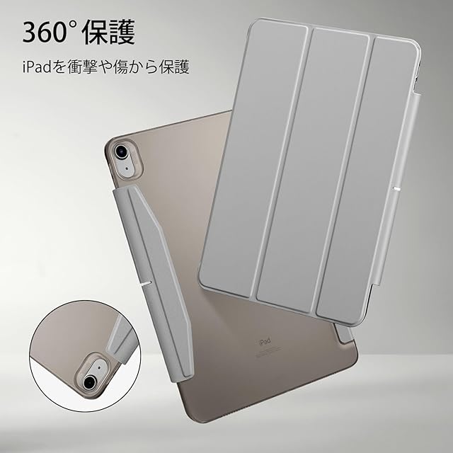ESR iPad Air 11インチ ケース (M3/M2、2025/2024) iPad Air 第5/4世代 ケース(2022/2020)専用 三つ折りスマートケース Pencil Proのペアリング・充電対応 留め具付き グレー
