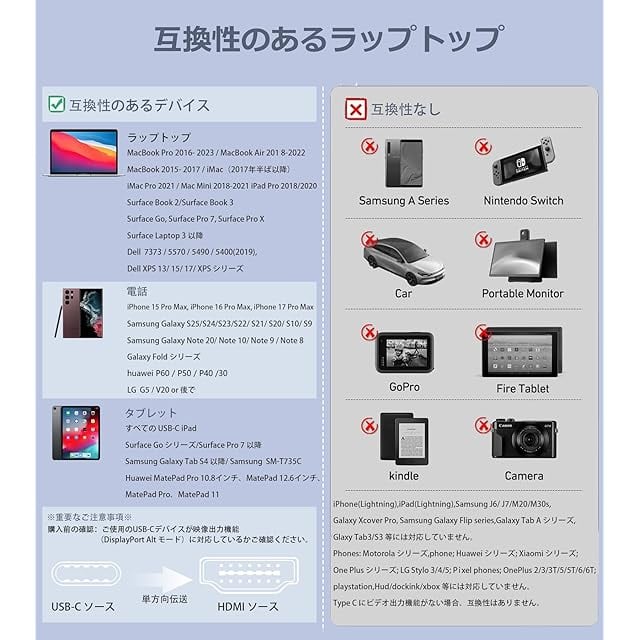 【幅広い機種対応】 対応機器:Samsung Galaxy (S25 S24 S23 S22 S21+/S21/S20+/S20/S10+/S10/S9+/S9) ,iPhone15 Pro Max Plus,iPhone16 Pro Max Plus,iMac、iPad Pro 2020/2018、MacBook Pro 2022/2021/2020、MacBook Air 2022/2021/2020、Dell XPS 15 シリーズ、Huawei P20 Pro、P30、P40、P50,および DP Alt モードをサポートするUSB C デバイス。(ご注意:Sony Xperia、Samsung、Xiaomi 、Sharp Aquosについて、ほとんど非対応機種となりますので、ぜひお先にお問い合わせください。)amsung は DeXをオンにする必要があり、通常の携帯電話はテレビに接続するために USB デバッグをオンにする必要があります。接続されたデバイスの USB-C ポートがビデオ出力をサポートしていることを確認してください。