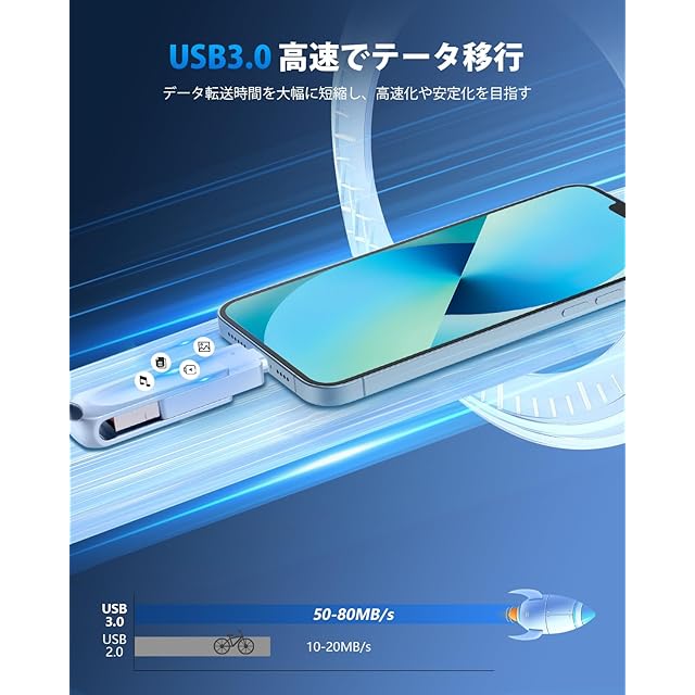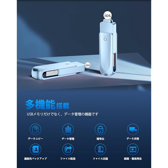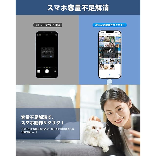 【スマホ容量不足解消・iCloud課金対策】ビッグデータの時代、スマホに保存されるデータはますます多くなり、iCloudはわずか5GBで、すぐいっぱいになり、容量が不足している問題は頻発します。今、写真、動画やファイルなどのデータはUSBメモリーにバックアップできて、iPhone対応USBメモリを使用し、容量不足の問題を簡単に解決できます。これからは、どの写真を削除するかを考える必要がなく、USBメモリを挿入し、データバックアップするだけで、スマホの空き容量を増やすことができます。iCloudにもこの以上課金する必要はなくなります。