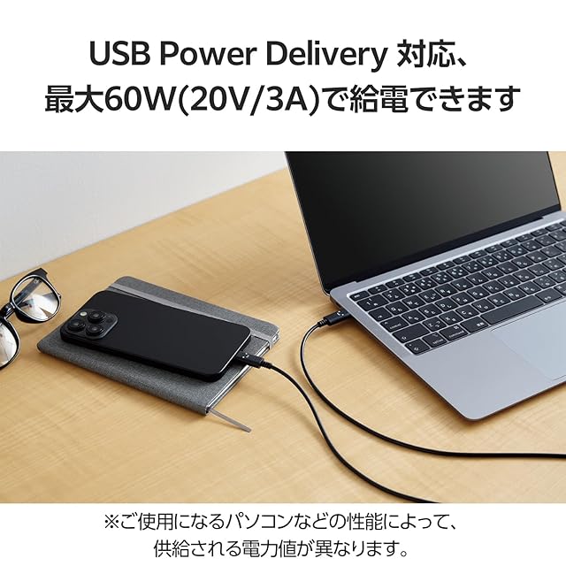 USB Power Delivery対応により、最大60W(20V/3A)の電力で接続機器への給電が可能です。