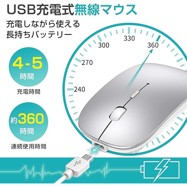 ワイヤレスマウス Bluetoothマウス 無線 超薄型 静音 充電式 省エネルギー 2.4GHz 3DPIモード 高精度 持ち運び便利 iPhone/iPad/Mac/Windows/Surface/Microsoft Proに対応 (シルバー) | つむぎ屋