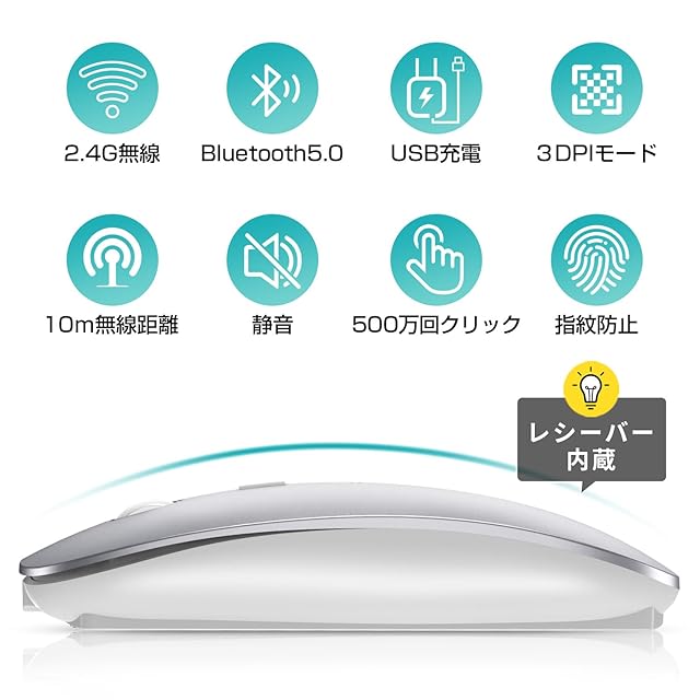 よくある質問: ①ブルーライトについて、接続の時に一瞬光るのタイプです、常に点灯している状態ではありません。 ②レシバーについて、レシバーはマウスの背面に収納されておりますので、ぜひご注意ください。 ③接続について、マウス背面のOFFボタンを接続のモードによって切り替わる必要があります。USBレシバーの場合は、スイッチを右の「2.4G」のところに移ります;Bluetoothの場合は、スイッチを左の「Bluetooth」のところに移って、それに、青いの「Bluetooth接続ボタン」を2~3秒ぐらい長押ししてペアリングできます。 注:商品使用について不明な点がございましたら、ぜひ店舗名をクリックして質問してください、迅速な対応を行います、ご安心ください。
