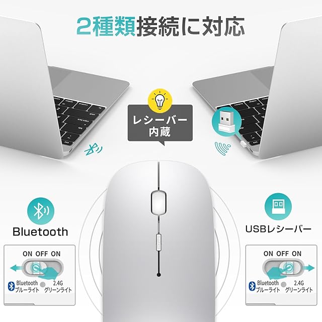 よくある質問: ①ブルーライトについて、接続の時に一瞬光るのタイプです、常に点灯している状態ではありません。 ②レシバーについて、レシバーはマウスの背面に収納されておりますので、ぜひご注意ください。 ③接続について、マウス背面のOFFボタンを接続のモードによって切り替わる必要があります。USBレシバーの場合は、スイッチを右の「2.4G」のところに移ります;Bluetoothの場合は、スイッチを左の「Bluetooth」のところに移って、それに、青いの「Bluetooth接続ボタン」を2~3秒ぐらい長押ししてペアリングできます。 ④「Mac book air m2」のようなtype-c 接続口の場合は、USBレシーバーには対応できません、ご注意ください。 注:商品使用について不明な点がございましたら、ぜひ店舗名をクリックして質問してください、迅速な対応を行います、ご安心ください。