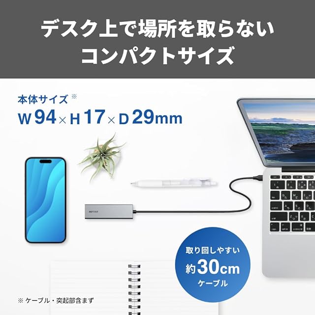 【取りまわしやすいケーブル】使い勝手に優れた約30cmケーブルで、PCスタンドとの併用にも便利
