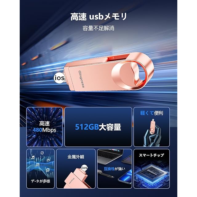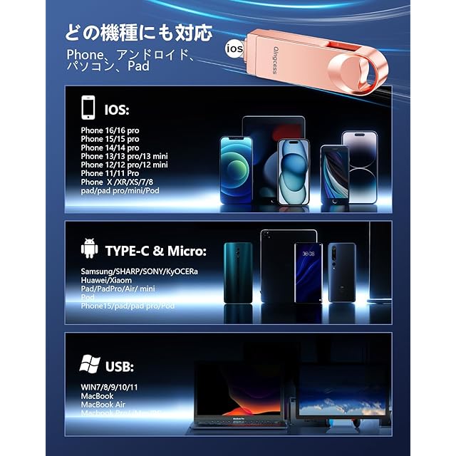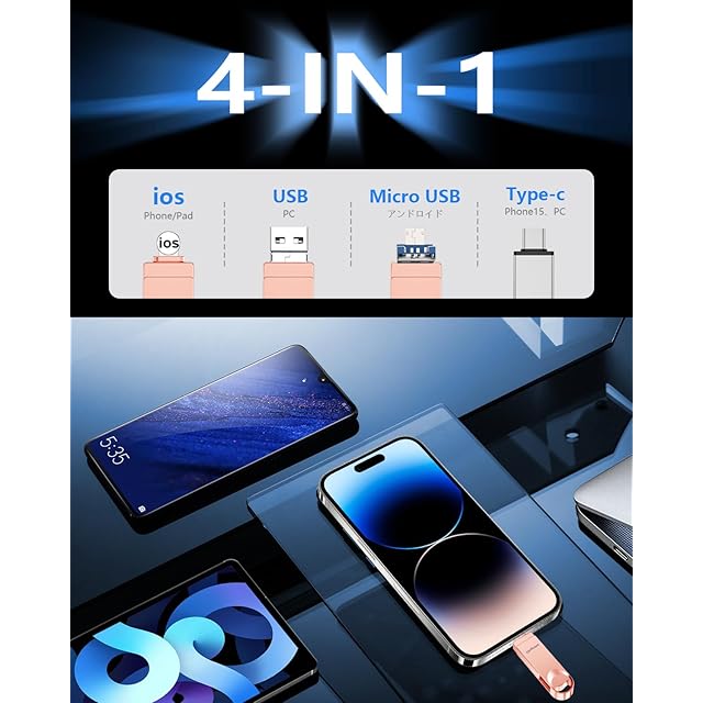 【4in1万能端子】メモリースティック にはios[ライトニング]/usbメモリ type-c/USB3.0/MicroUSBの4WAY設計。Phone16Pro MaxからPCまで、日本で人気の全137機種を完全対応。( 16 Pro/16 Plus/16/......11 /XR/X /8/i Pad(第1/2/3世代)/ MacBook/ パソコン/ Type-Cスマホ/ Android /タブレットなどとデータ移行保存 互換性のあるスマホ用 usbメモリ。)