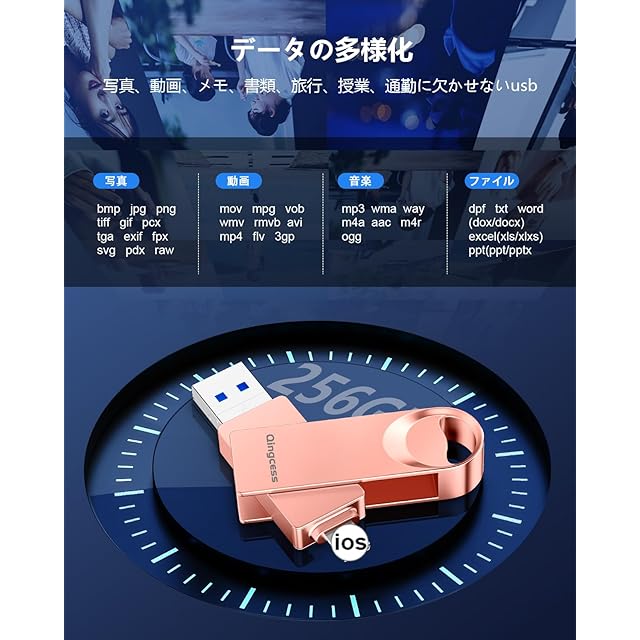 【スマホ容量不足解消-プロ級容量管理】アイフォンusbは256GBで高画質写真57,00枚・4K動画多時間分を保存可能。保存した携帯写真データはUSB内で直接再生可能(HEIC/MP4/PDF等37形式対応)。iCloudの月額2,130円(2TB)と比較し5年分のコストを削減。ビジネスファイルから家族動画まで、スマホを軽くする(Phone ストレージ)「デジタル断捨離」を実現。