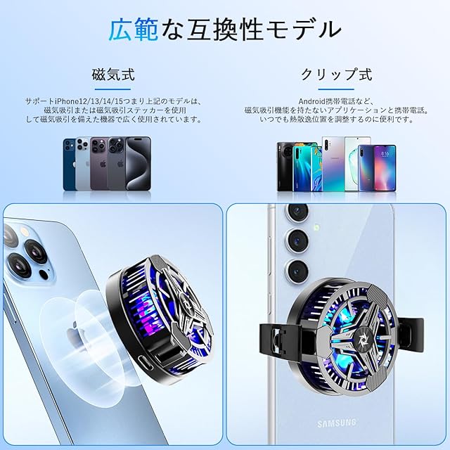 【クリップ式&磁力吸着式】本製品には、マグネット磁石が内蔵されており、iPhone12シリーズ以上の型番には貼り付け用鉄板が要らず、直接スマホの裏面に吸着することができます。また、クリップと貼り付け用鉄板が付属しており、クリップ式で画面サイズが4.7〜6.7インチの携帯電話にも対応可能です、さまざまな携帯電話に対応本製品は複数機種の機器に対応しております。 A: iPhone 12 以降の場合、磁気携帯電話は直接吸着できます。 B: 製品にはパッチが付いており、携帯電話/タブレットの背面に貼り付けることができます。 C: クリップを使用して電話機をクランプし、クリップ アクセサリをラジエーターの両端にあるノッチに埋め込みます。 クリップを使用して他の電話モデルに取り付けることができます。