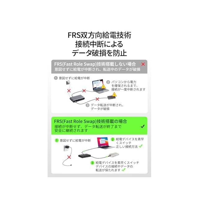 【幅広い互換性と高い安定性】下位互換性を備えた MacBook、iPad、Chromebook、および Windows のユニバーサルな互換性。USB-C ヘッドフォン、スピーカー、または任意のオーディオ インターフェイスを含むオーディオをサポート。Fast Role Swap (FRS) は、ハブから USB 電源を追加または削除する際のデータ損失とデバイス接続の中断を防止します。